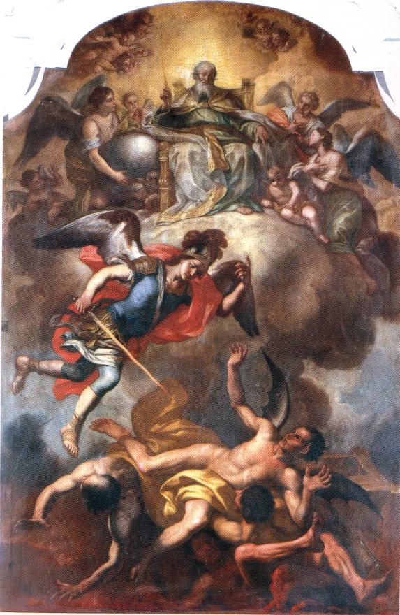 Il San Michele che abbatte Lucifero si rifà a schemi precedentemente adoperati in altre tele, anche di soggetto analogo, mentre la tipologia dell'Eterno Padre ricorda quella della pala di San Vito, datata 1745.